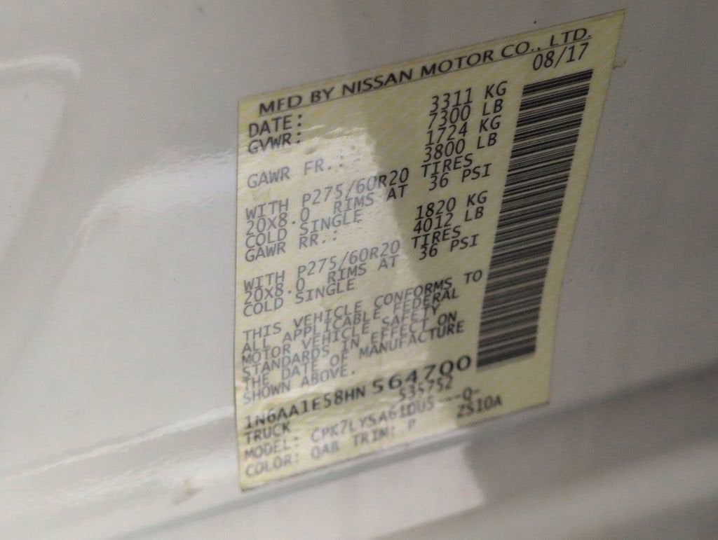 This Titan Platinum Reserve is nicely equipped with Platinum Reserve Bed Utility Package (TITAN Box), 4WD, 12 Speakers, 2.937 Axle Ratio, 4-Wheel Disc Brakes, ABS brakes, Air Conditioning, Alloy wheels, AM/FM radio: SiriusXM, Auto tilt-away steering wheel, Auto-dimming door mirrors, Auto-dimming Rear-View mirror, Automatic temperature control, Blind Spot Warning, Brake assist, CD player, Chrome wheels, Compass, Delay-off headlights, Driver door bin, Driver vanity mirror, Dual front impact airbags, Dual front side impact airbags, Electronic Stability Control, Emergency communication system: NissanConnect Services, Front anti-roll bar, Front Bucket Seats, Front Center Armrest, Front dual zone A/C, Front fog lights, Front reading lights, Front wheel independent suspension, Garage door transmitter: HomeLink, Heated & Cooled Front Captain's Chairs, Heated door mirrors, Heated front seats, Heated rear seats, Heated steering wheel, Illuminated entry, Leather Shift Knob, Leather steering wheel, Low tire pressure warning, Memory seat, Navigation System, Occupant sensing airbag, Outside temperature display, Overhead airbag, Overhead console, Panic alarm, Passenger door bin, Passenger vanity mirror, Power door mirrors, Power driver seat, Power passenger seat, Power steering, Power windows, Premium Leather Seat Trim, Radio data system, Radio: NissanConnect w/SiriusXM/Navi & Mobile Apps, Rain sensing wipers, Rear anti-roll bar, Rear seat center armrest, Rear step bumper, Rear window defroster, Remote keyless entry, Security system, Speed control, Speed-sensing steering, Speed-Sensitive Wipers, Split folding rear seat, Steering wheel memory, Steering wheel mounted audio controls, Tachometer, Telescoping steering wheel, Tilt steering wheel, Traction control, Trip computer, Turn signal indicator mirrors, Variably intermittent wipers, Ventilated front seats, Voltmeter, and Wheels: 20 Dark Chrome Clad. Price does not include licensing costs, registration fees, taxes and dealer doc fee of $899.50 which are to be paid by the consumer.