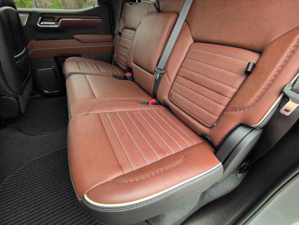 This Sierra 1500 Denali Ultimate is nicely equipped with Preferred Equipment Group 5SB (120-Volt Bed Mounted Power Outlet, 120-Volt Interior Power Outlet, 2 Charge/Data USB Ports Inside Center Console, 2 Type-C Charge-Only Rear USB Ports, 2 USB Ports, Auto-Locking Rear Differential, Bed View Camera, Bose Premium Series w/12-Speaker System, Chrome Recovery Hooks, Color-Keyed Carpeting Floor Covering, Deep-Tinted Glass, Electric Rear-Window Defogger, Floor-Mounted Center Console, Front Rain-Sensing Wipers, GMC Connected Access Capable, HD Surround Vision, Heated 2nd Row Outboard Seats, Heated Driver & Front Outboard Passenger Seating, Heavy-Duty Air Filter, Hill Descent Control, Hitch View, In-Vehicle Trailering System App, Integrated Trailer Brake Controller, Keyless Open & Start, LED Cargo Area Lighting, Multicolor 15 Diagonal Head-Up Display, MultiPro Tailgate Audio System by Kicker (LPO), OnStar & GMC Connected Services Capable, Perimeter Lighting, Power Door Locks, Power Front Passenger Windows w/Express Up/Down, Power Front Windows w/Driver Express Up/Down, Power Rake & Telescoping Steering Column, Power Rear Windows w/Express Down, Power Sliding Rear Window w/Rear Defogger, Power Sunroof, Push Button Start, Rear Cross Traffic Braking, Rear Pedestrian Detection, Rear Wheelhouse Liners, Remote Vehicle Starter System, SiriusXM w/360L, Spray-On Pickup Bedliner w/Denali Logo, Steering Wheel Audio Controls, Theft Deterrent System (Unauthorized Entry), Trailer Camera Provisions, Trailer Side Blind Zone Alert, Trailer Tire Pressure Monitor System, Ultrasonic Front & Rear Park Assist, Universal Home Remote, Vader Chrome Header w/Signature Denali Grille, Ventilated Driver & Front Passenger Seats, Wi-Fi Hotspot Capable, and Wireless Charging), Trailering Package (Hitch Guidance), 10-Speed Automatic, 4WD, Alpine Umber Leather, 12 Speakers, 16-Way Power Driver Seat Adjuster w/Lumbar, 16-Way Power Passenger Seat Adjuster w/Lumbar, 170 Amp Alternator, 3.23 Rear Axle Ratio, 4-Wheel Disc Brakes, ABS brakes, Adaptive suspension, Air Conditioning, Alloy wheels, AM/FM radio: SiriusXM with 360L, Apple CarPlay/Android Auto, Auto High-beam Headlights, Auto-dimming door mirrors, Auto-dimming Rear-View mirror, Automatic temperature control, Body Color Wheel Arch Moldings (LPO), Brake assist, Buckle to Drive, Bumpers: body-color, Carbon Fiber Composite Bed, Compass, Delay-off headlights, Denali Premium Suspension w/Adaptive Ride Control, Driver door bin, Driver Memory, Driver vanity mirror, Dual Active Exhaust, Dual front impact airbags, Dual front side impact airbags, Electronic Stability Control, Emergency communication system: OnStar and GMC connected services capable, Enhanced Automatic Emergency Braking, Following Distance Indicator, Forward Collision Alert, Front anti-roll bar, Front Bucket Seats, Front Center Armrest, Front dual zone A/C, Front fog lights, Front Pedestrian Braking, Front reading lights, Front wheel independent suspension, Full Grain Leather Seat Trim, Fully automatic headlights, Garage door transmitter, Genuine wood console insert, Genuine wood dashboard insert, Genuine wood door panel insert, GMC MultiPro Tailgate Step Lights (LPO), Heads-Up Display, Heated door mirrors, Heated front seats, Heated rear seats, Heated steering wheel, Illuminated entry, IntelliBeam Automatic High Beam On/Off, Lane Keep Assist w/Lane Departure Warning, Low tire pressure warning, Memory seat, Navigation System, Occupant sensing airbag, Outside temperature display, Overhead airbag, Overhead console, Panic alarm, Passenger door bin, Passenger vanity mirror, Power door mirrors, Power driver seat, Power moonroof, Power passenger seat, Power steering, Power windows, Premium audio system: GMC Infotainment Sy